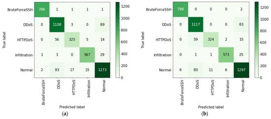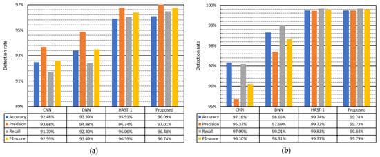 Figure 5 and Figure 6 show the confusion matrices for each algorithm for the two datasets. The confusion matrix is advantageous for analyzing detailed performance because it can analyze the performance of individual classes. When using ISCXIDS2012, the proposed method has a slightly lower detection rate for distributed denial-of-service (DDoS) than HAST-I but exhibits the highest performance for the other classes.
