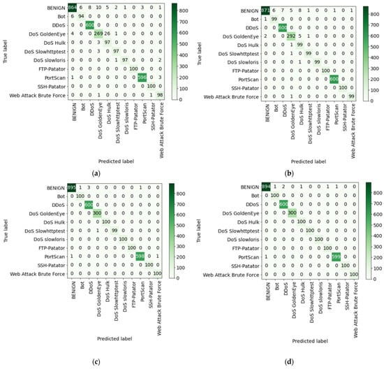 Confusion matrix for each NIDS using CIC-IDS2017. (a) CNN; (b) DNN; (c) HAST-I; (d) Proposed.