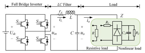Figure 1 depicts a full-bridge inverter’s usual configuration. L and C are the filter-parameters; re is the inductor’s equivalent series resistance (ESR); io is the output current and iL is the inductor current; Udc denotes the dc-link voltage; and uin and uo are the input and output voltage, respectively. This work investigates the resistive load R and the nonlinear load. Specifically, the nonlinear load is made up of a resistor Rs and a diode rectifier bridge that feeds a capacitor Cz in parallel with a resistor Rz.