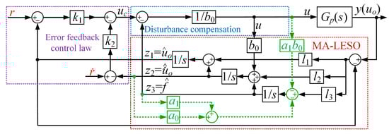 Based on the above analysis, the LADRC-based control block schematic can be shown in Figure 3, which includes the LESO, the disturbance compensation block, and the error feedback control law. e = r − uo denotes the tracking error. According to Equation (9), its transfer function can be derived as
