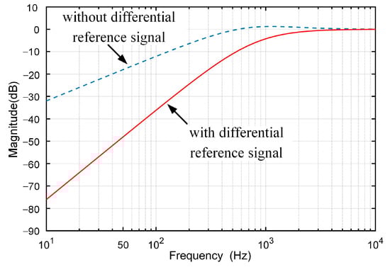 The bode magnitude plots of the tracking error transfer function with and without differential reference is compared, as shown in Figure 4. Notice that the introduction of the differential reference helps to improve the voltage tracking performance. However, because the unknown periodic disturbances such as the changing loads and the observation errors of LESO still exist, the system cannot be accurately compensated. Thus, a non-negligible steady-state error and THDu still exist when a fixed differential reference is given.