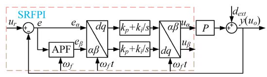 A virtual orthogonal signal is essential for single-phase inverter regulation in SRF. A first-order all-pass filter (APF), HAPF(s) = (ωf − s)/(ωf + s), can be adopted to generate the orthogonal signal of e; namely, eβ. The block diagram of the SRFPI-based voltage controller is illustrated in Figure 6, where ur denotes the voltage reference, uα and uβ denote the outputs of SRFPI, dext is the external disturbance, P represents the plant, and the proportion and integral coefficients are denoted by kp and ki.