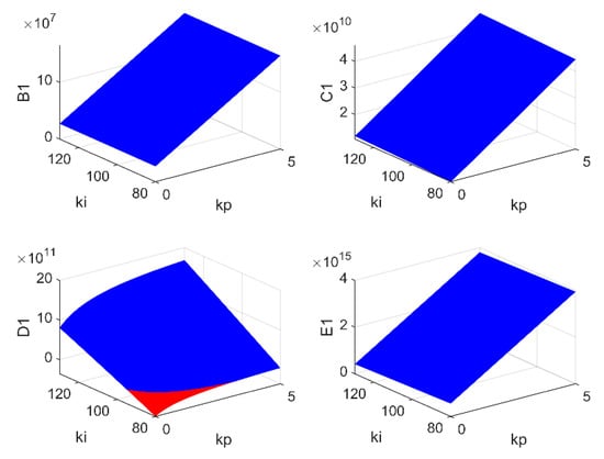 Note that A1 satisfies the discriminant. Due to the complexity of the characteristic polynomial, the ranges of parameters are artificially set (kp varies from 0 to 5 and ki varies from 0 to 130) and relevant three-dimensional diagrams are depicted as shown in Figure 8. The blue areas indicate that the PI parameters meet the stability discriminant, and the red area is unstable. It is evident that the parameters can stabilize the system over a wide range, which indicates that these two controllers remain relatively independent without complicating the controller design.