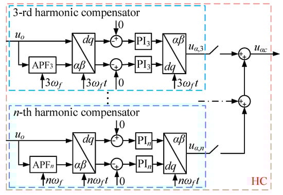 To eliminate the odd harmonic components of the output voltage especially under nonlinear load conditions, multiple SRFPI controllers are selectively connected in parallel as HC. Figure 11 depicts the structure of HC, where n = 2m − 1(m ≥ 2). The sum of the output signal of SRFPI uα and the output signal of HC uαc serves as the voltage reference signal of LADRC.