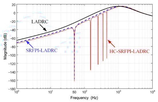 According to Equation (20), the bode magnitude plots of three control methods are pictured in Figure 12. It shows the inverter system has a better disturbance suppression capability especially at a fundamental angular frequency with the SRFPI-LADRC. This ability is further enhanced by introducing the HC. Therefore, the proposed control technique can efficiently inherit and enhance the anti-load disturbance capability, which means a satisfactory voltage tracking performance and THDu can be obtained.