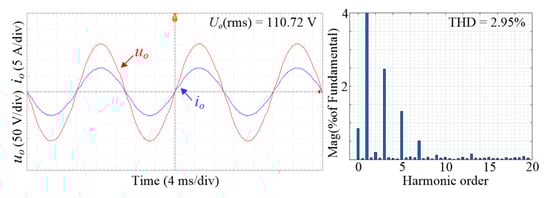 Table 4 provides a summary of the experimental results for several test cases, including THDu, tracking error and output voltage (RMS value). The measuring results of the SRFPI-LADRC strategy proposed in [22], which has no differential voltage reference for LADRC, are listed as well for comparison. To make the comparison persuasive, the parameters of the overlapping parts of these methods stay consistent intentionally. It was unequivocally shown that the inverter using the suggested scheme obtained an evident performance improvement, which proves that it combines the advantages of both controllers. These merits further benefit from the HC. It should be pointed out the HC will increase the calculation time to a certain extent. The TMS320F28335 DSP chip took 18.7 μs to run the key algorithms when the 3rd, 5th, 7th, and 9th harmonic compensators are added in our experimental test.