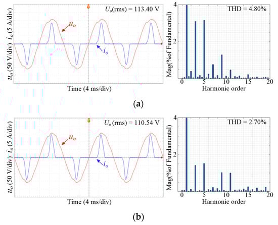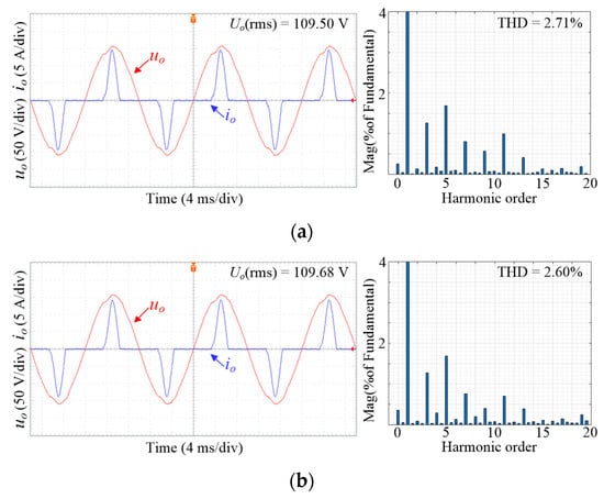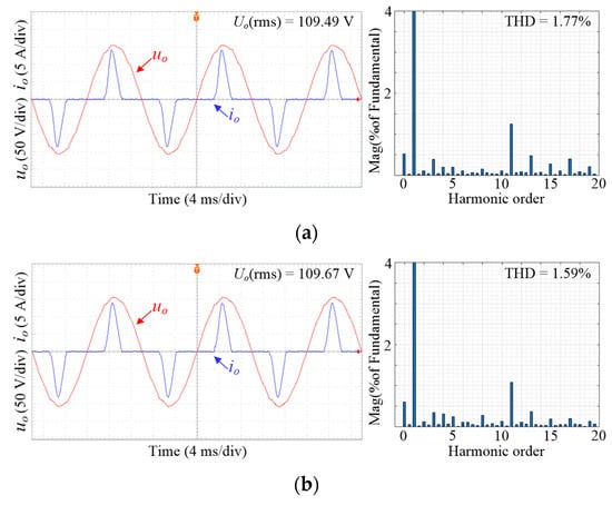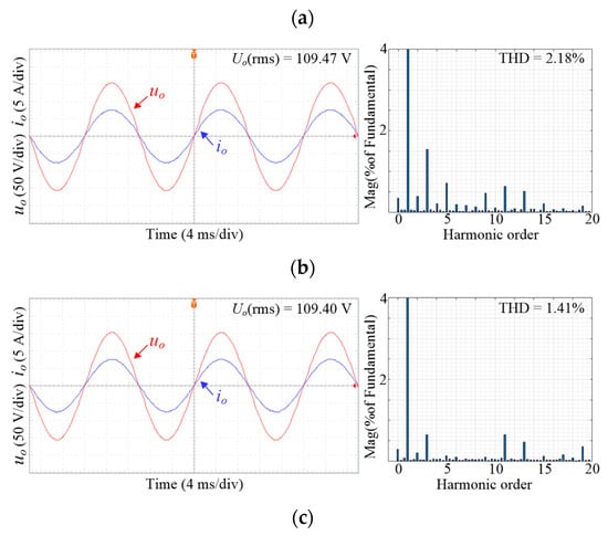 The experimental steady-state waveforms feeding a rated resistive load (20 Ω) are shown in Figure 14. It was difficult for the LSEO of LADRC to accurately estimate the disturbance due to the periodicity of the output current perturbation, which resulted in a relatively higher voltage THD. The proposed control strategy can improve this defect. By adopting the harmonic compensation, the 3rd, 5th, 7th, and 9th harmonic components were greatly diminished, which proved the effectiveness of the selective harmonic suppression capability of HC. The waveforms of the voltage tracking error are shown in Figure 15. It can be verified that the proposed control strategy effectively enhances the tracking performance and achieves better results when HC works (3.21 V vs. 1.75 V vs. 1.04 V).