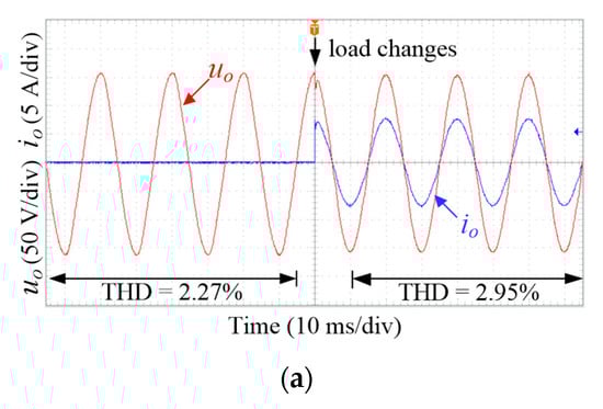 The investigation of dynamic response under a load step from no load to a rated resistive load is depicted in Figure 16. Compared with the LADRC, the proposed control strategy successfully reduced the THDu without affecting the dynamic performance. It further demonstrated an excellent efficacy against load variation since the voltage amplitude of the compound control scheme recovered in about one fundamental cycle. There was also relative improvement with the help of HC.