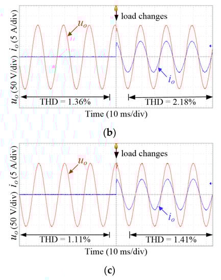 As depicted in Figure 19 and Figure 20, experiments under nonlinear load condition were conducted to verify the robustness with parameter drifts of LA (±20%). The system stayed stable and maintained a low THDu, which means the SRFPI-LADRC and the HC-SRFPI-LADRC are quite robust to the perturbation in parameters.