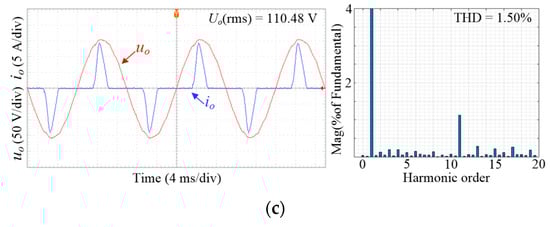 A 605-W single-phase inverter prototype was built as depicted in Figure 13, and experiments were conducted to confirm the suggested control scheme. A DSP chip (TMS320F28335) was used to execute the control algorithm. An oscilloscope model TBS2014X from Tektronix was used to record the waveforms. Table 3 lists the associated parameters. Three controllers, including LADRC, SRFPI-LADRC, and HC-SRFPI-LADRC, were evaluated and contrasted.