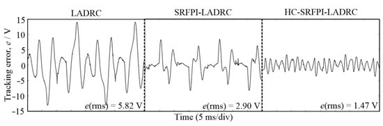 Figure 17 depicts the steady-state waveforms under a highly nonlinear load (Rs = 1 Ω, Cz = 2700-μF, Rz = 30-Ω). All the output currents had strong harmonic components, and their crest factors were close to 3. Even so, compared to LADRC, the SRFPI-LADRC can maintain the sinusoidal output voltage waveform with little distortion, and the THDu was further reduced when HC was adopted (4.80% vs. 2.70% vs. 1.50%). The tracking error was decreased by introducing the SRFPI as illustrated in Figure 18. Owing to the HC block, this advantage has been further amplified.