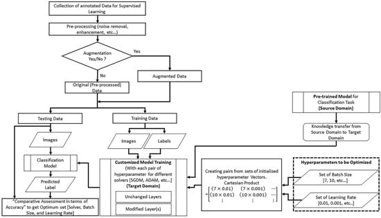 Any pre-trained classification model with its learned parameters can be used after customization. The framework is based on an idea to input hyperparameters in the form of ordered pairs (batch size and learning rate). The ordered pair can be defined as a 2-tuple element of a matrix constructed using the concept of the Cartesian product of two initialized sets of the batch size and learning rate. The following subsections discuss the step-by-step implementation of the transfer learning technique using the adopted framework.