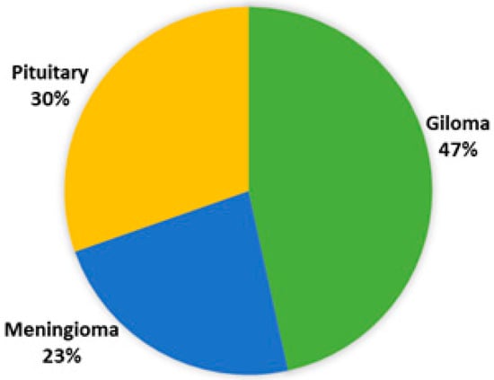Exactly 3064 MR images from a publicly available dataset of 233 patients with brain tumors were used [25]. This collection contained three different types of brain tumor MR images, including 1426 slices of gliomas, 708 slices of meningiomas, and 930 slices of pituitary tumors. Each type of tumor proportion in the dataset is shown in Figure 2 [10]. These data, which are accessible in .mat file (Matlab data format), include a patient ID, a label for the image, the picture as a 512 by 512 matrix, a tumor mask, and discrete point coordinates on the tumor border.