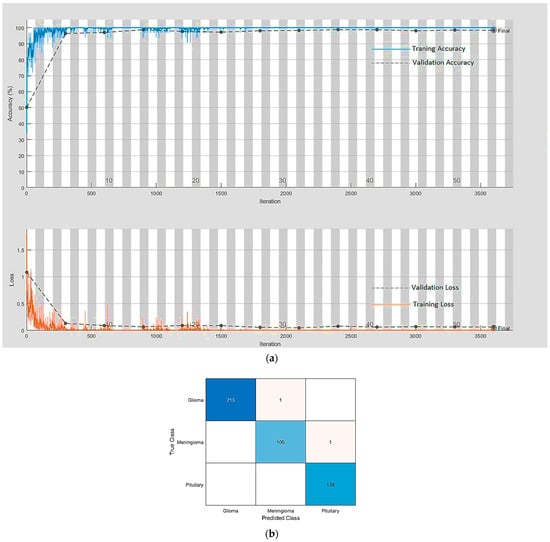 An extensive exercise, comprising 504 simulations on the best-performing [10] three cutting-edge architecture-based pre-trained DL models, ResNet18, ResNet50, and ResNet101 were performed. Additionally, the impact was also assessed by using three well-known optimization algorithms (solvers): the adaptive moment estimation (Adam), the stochastic gradient descent with momentum (SGDM), and the root mean squared propagation (RMSProp). The three best-performing ResNet variants were selected with the help of a comparative analysis in which three ResNet variants were compared with other start-of-the-art classification models as presented in Table 2. The parameters to compare were the number of epochs utilized in convergence, number of iterations, validation accuracy, training time, and confusion matrix. All three variants of ResNet, especially ResNet18, outperformed all other networks with parameters {SGDM, 32, 0.01} by achieving 99.56% accuracy when using our framework for brain tumor classification. This was due to the ResNet working principle of building a deeper network compared to other networks and its capability to solve the vanishing gradient problem simultaneously. Figure 6a,b depict the training-validation accuracy and loss curve and the confusion matrix while training, validating, and testing ResNet18, the best-performing model. In addition to the ultimate accuracy measurement, utilizing three other measures: precision, recall, and specificity, the framework was further evaluated. Table 3 summarizes the performance measures related to the above-mentioned measuring parameters for the average of all classes and each class separately as well for all deep learning networks presented in Table 2. The comparison shows that ResNet18 outperforms all the others in all the measuring fields. Figure 6 clearly describes the condition that we had achieved a solution of our optimization problem, defined in Section 3.1.4, with the optimal hyperparameters’ values () using the SGDM solver. The solution, ultimately, provided us with an optimized model with the highest accuracy of 99.56% for the brain tumor classification problem.