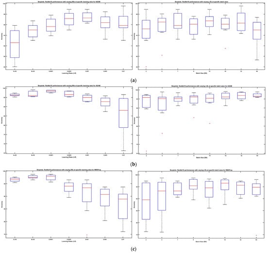 Furthermore, Figure 7 shows boxplots, demonstrating the collected results’ distribution for the ResNet18 DL model retrained on our brain tumor dataset with solvers SGDM, Adam, and RMSProp. On the left side, each boxplot exhibits a distribution of measured accuracies for the given range of BSs at each specific LR starting from 0.00001 to 0.01. On the right side, each boxplot exhibits a distribution of the measured accuracies for the given range of LRs at each specific BS starting from 2 to 64. Each boxplot represents the lower quartile, median, and upper quartile, and whiskers extend to the end of the sample range to display the maximum and minimum accuracies.