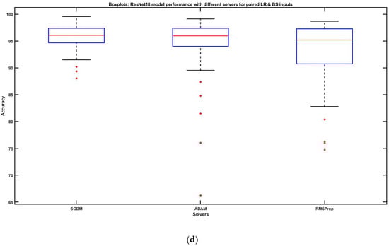 Figure 7d reveals the joint impact of LR and BS on the data set while comparing the model performances using SGDM, Adam, and RMSProp. We observed that concerning the brain tumor classification, SGDM had the most optimum performance in comparison to Adam and RMSProp as it reached the maximum accuracy and has the lowest dispersion too. The dispersion of outputs was gradually increasing in Adam and RMSProp, respectively. Although the whiskers maxima and the upper quartile were almost the same for all three solvers, the lower quartile was gradually decreasing. Conclusively, the experimental results show that both hyperparameters (LR and BS) had a significant impact individually as well as interactively, with a trade-off in between.