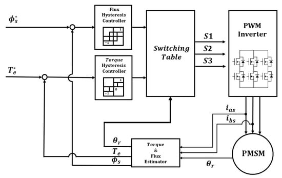 - Shinohara, A.; Yamamoto, K. Estimation Error Analysis of Stator Flux Observer for DTC-Based PMSM Drives. In Proceedings of the 2018 International Power Electronics Conference (IPEC-Niigata 2018-ECCE Asia), Niigata, Japan, 20–24 May 2018; pp. 1308–1314. [Google Scholar]