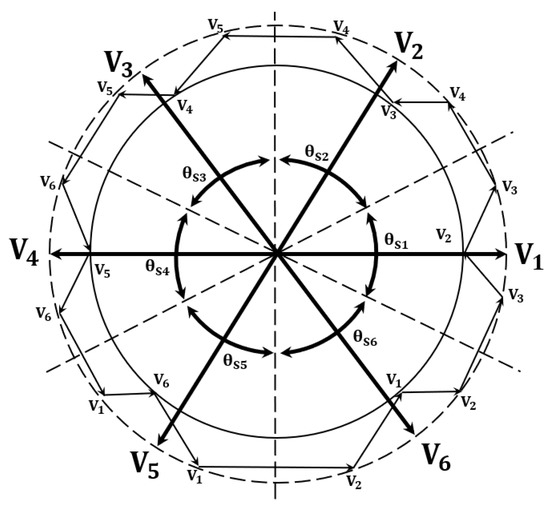 Through the torque obtained in Equation (4), it can be seen that, if the stator flux linkage is kept constant, the torque can be controlled through the torque load angle . Since the electrical response is very short compared to the mechanical response time, the load angle can be adjusted by instantaneously adjusting the position of the stator magnetic flux using the stator voltage vector.