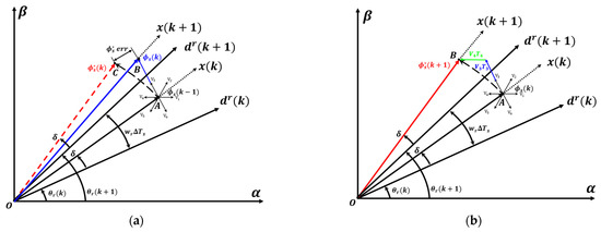 In order to apply the PMSM mathematical model to the DTC control technique, Equations (1) and (2) can be discretized with a fixed control period and arranged in Equation (5). In addition, if this is arranged based on the stator flux linkage standard, it can be expressed as Equation (6). As the speed increases, the magnitude of the stator resistance is relatively very small, so if ignored, it can be seen that the position of the stator flux at the point of can be adjusted according to the d-axis voltage and q-axis voltage command through the corresponding equation.