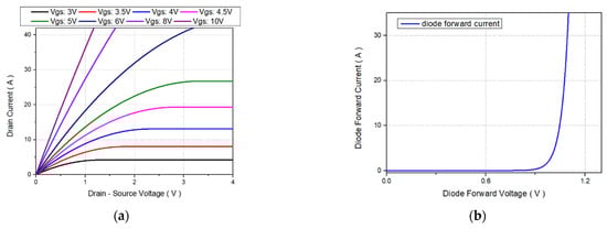 In addition, when the diode conducts in the forward direction during dead time, a diode voltage drop component is added and applied to the motor according to the magnitude of the current. The magnitude of the voltage drop component of the diode and MOSFET changes nonlinearly according to the magnitude of the current. This is shown in Figure 8a,b.