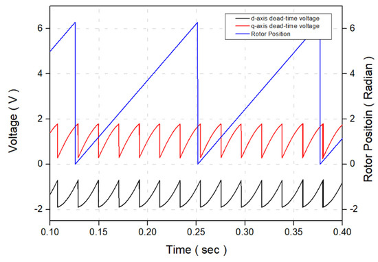 Distorted voltage due to dead time appearing on the − coordinates waveform , , and the motor rotor angle waveform .