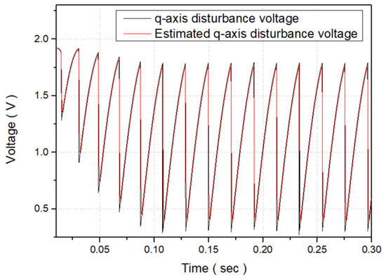 The actual disturbance voltage occurring on the -axis during the dead time and the -axis disturbance compensation voltage waveform estimated through the disturbance observer.