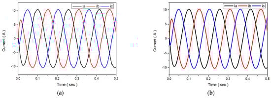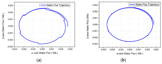 First, Figure 16 shows the stator flux trajectory waveform when controlling a DTC torque of 1.5 Nm. As shown in Figure 16a, it can be seen that the stator flux trajectory is distorted by the distorted voltage generated during the dead time rather than being circular. This confirms that there are six ripples per rotation in the stator flux trajectory, as well as confirming that the disturbance voltage is six times the electrical angular velocity of the motor through the previous section. Figure 16b shows the stator flux trajectory when the voltage is compensated using the proposed disturbance observer. Compared to Figure 16a, it can be confirmed that the ripple seen in the stator flux trajectory is clearly reduced. As mentioned above, the estimated stator flux trajectory has a great influence on the performance of the DTC-SVM controller. Subsequently, Figure 17a,b shows the torque ripple when the voltage is not compensated and when the voltage is compensated by applying the proposed disturbance observer. As shown in Figure 17, it can be confirmed that the torque ripple is significantly reduced. Finally, in Figure 18a,b, the current waveforms of the three phases of the stator are compared with and without the compensation for the disturbance voltage generated during the dead time. As can be seen through the two waveforms, the distortion of the stator current waveform is significantly reduced.