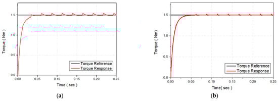 Torque ripple that occurs during DTC torque control. (a) Scenario with no compensation for disturbance voltage generated during the dead time (b) Scenario when the disturbance voltage generated during the dead time is compensated using a disturbance observer.