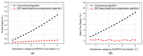 (a) Comparison of torque ripple for disturbance voltage generated by MOSFETs and diodes when applying the conventional algorithm and the proposed EKF-based control algorithm (b) Comparison of stator flux ripple for disturbance voltage generated by MOSFETs and diodes when applying the conventional algorithm and the proposed EKF-based control algorithm.