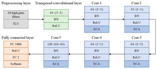The model consists of one preprocessing layer, one transposed convolutional layer, five ordinary convolutional layers (including the ECA module), and two fully connected layers. The preprocessing layer filters the image using 30 high-pass filters, and the weights of each high-pass filter are kept constant during training while all are taken from the SRM. The filtered image is input to the transposed convolutional layer for upsampling, doubling the size of the feature map. At the same time, the steganographic noise is also amplified, which facilitates the extraction of steganographic features by the ordinary convolutional layers later. The transposed convolutional layer is a 3 × 3 convolutional kernel with a stride of 2. Subsequently, the feature map enters the ordinary convolutional layers. The first convolutional layer and the third convolutional layer have the same convolutional kernel size of 3 × 3, and the second and fourth convolutional layers have convolutional kernels size of 1 × 1. The fifth one is global convolution, and the convolutional kernel size is the same as the feature map output from the fourth convolutional layer, which is 64×64. Among the five ordinary convolutional layers, the number of channels in Conv1, Conv3, and Conv4 is all 64, and the number of channels in Conv2 and Conv5 is 32 and 128, respectively. The network model is finally classified by two fully connected layers and a softmax function for the feature maps. In the whole model constructed, the preprocessing layer is followed by the TLU activation function, and both the transposed convolutional layer and the ordinary convolutional layer are followed by the batch normalization (BN) and the ReLU activation function. The ECA module assigns weights to the feature maps after each convolution layer to enhance the steganographic features.