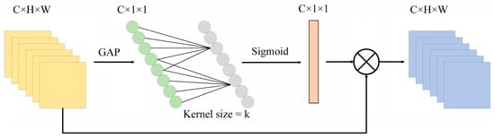 In Equation (3), and are the width and height of the feature map. Let the number of channels in the input feature map be C. After global average pooling, the feature map of the dimension is output. Then, we capture the local cross-channel interaction information using a one-dimensional convolution with a convolution kernel of size and generate the channel weights using a Sigmoid nonlinear activation function. The formula is shown in Equation (4), where is the Sigmoid function and is the one-dimensional convolution.