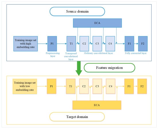 Feature migration is the transfer of the features extracted using the pre-trained model with high embedding rates to the target domain with low embedding rates. Since the overall model structures of the source and target domain training are the same, feature migration can also be interpreted as the parameter information saved by the pre-trained model as the initialization parameters for target domain training, which can improve the learning efficiency and training cost of the target domain.