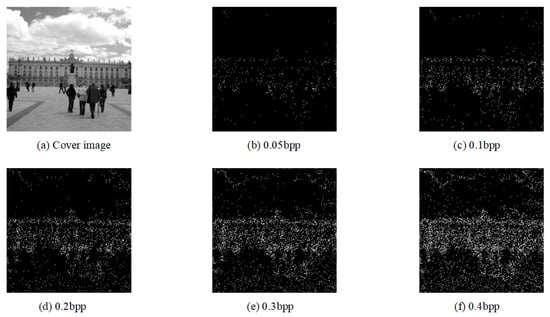 In the adaptive image steganographic algorithm, as the embedding rate increases, the difference between the cover image and the secret image changes becomes more and more obvious. Figure 4a shows a cover image in the BOSSbase dataset [31]. Figure 4b–f shows the change in the secret information embedding using the S-UNIWARD algorithm at 0.05 bpp, 0.1 bpp, 0.2 bpp, 0.3 bpp, and 0.4 bpp. The black dots in the image are the unchanged pixels, and the white dots are the pixels altered by the algorithm.