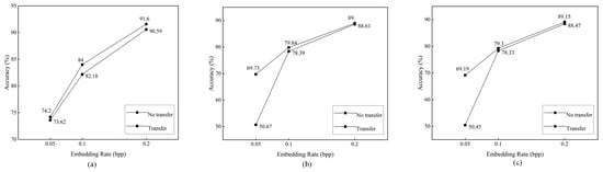 When the models are transferred, the principle of “proximity” migration is adopted, i.e., the models with an embedding rate of 0.4 bpp are transferred to the models trained with 0.3 bpp, the models with an embedding rate of 0.3 bpp are transferred to the models trained with 0.2 bpp, and so on to the models with 0.1 bpp and 0.05 bpp. In Figure 5, it can be seen that at 0.05 bpp, all three steganographic algorithms are better improved in accuracy using transfer learning, among which the accuracy improvement is more obvious for the WOW and HUGO algorithms, indicating that transfer learning enables the models to jump out of the local optimum at lower embedding rates. At both 0.1 bpp and 0.2 bpp, the detection accuracy of transfer learning is also improved compared with that without the introduction of transfer learning. However, at 0.2 bpp, the training model without the introduction of transfer learning can learn enough steganographic features, and the accuracy improvement is more negligible with the introduction of transfer learning. In summary, we can conclude from the experiments that the proposed model using transfer learning can further improve the model detection of the low embedding rate.