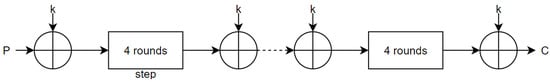 The cipher process is the combination of two operations: AddRoundKey and step (see Figure 1). The step operation is computed s times while the AddRoundKey is computed times. This value depends on the key length: for a 64-bit key and for a 128-bit key.
