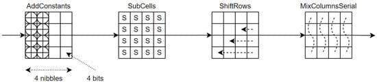 The step operation is composed by four rounds themselves composed by four operations, , , , and (See Figure 2), while the AddRoundKey operation is the combination of the state and the subkeys using XOR.