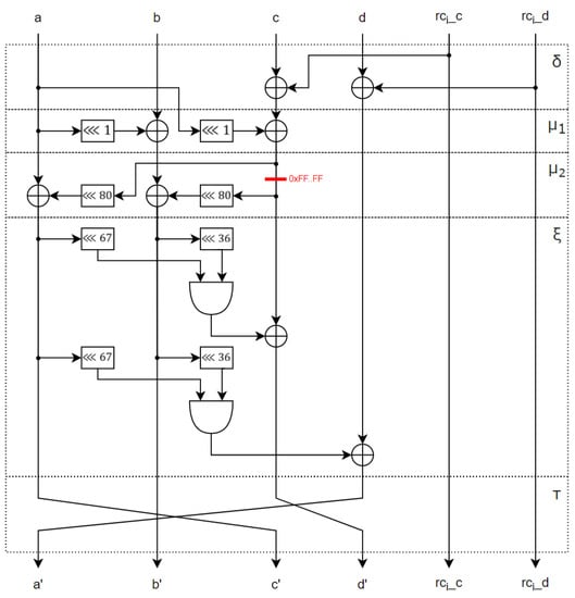 Let as Friet manipulates 128-bit data. For the sake of simplicity, we call a, b, c, and d the inputs of the operation. For the same reason, , , , and are the outputs of the operation. During these operations, the parity equation followed is . This parity equation is checked to ensure that no fault is injected. We inject the additive fault into the word c during the operation, and, after that, the rotated word c is added to a and to b before the addition. The fault injection is illustrated in Figure 4, with the red line showing the modification.