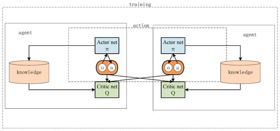 In order to solve the problem of reinforcement learning with incomplete information, we introduced the observation space of a partially observable Markov decision process (POMDP), which is on the basis of MDPs. A POMDP is defined as A tuple of , where are similar to the definition of the MDP. is the observation space, note that is different from that is the observation perceived by agent 1. Agents may observe differently at the same state because of the observation probability . The MADDPG algorithm [15] is an extension of the DDPG algorithm in multi-agent reinforcement learning. It uses a “centralized training, decentralized execution” architecture, which requires additional state and action information about other agents only in the training phase. The state of the agent itself is necessary to output the policy action. The architecture frame diagram of MADDPG is shown in Figure 2. Each agent has two networks: an Actor-network π and a critic network Q. The actor network calculates the action to be performed based on the agent’s state, and the critic network is responsible for evaluating the movement to improve the performance of the Actor-network. Using the Q-value network to break the correlation by randomly reading the experience pool data makes the training results more stable. At the same time, during the training process, the Actor-network only copies and observes its information, while the critic network is responsible for monitoring other agents.