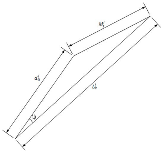 The relationship between the initial position of our UAV, its position at time step t and the dynamic target position of the enemy at time step t is approximately linear. is the initial distance, is the distance between the enemy’s initial and current position. is the moving distance of the dynamic target, and is the angle between the initial position of the UAV and the current position at step t. The distance between the UAVs can be described in Figure 3.