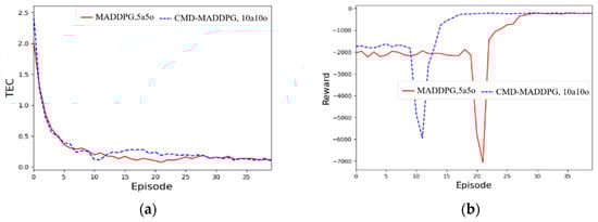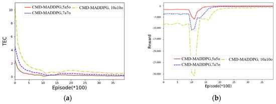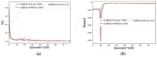 By establishing the CMD-MADDPG algorithm model, three UAVs are trained to plan a good path in the case of two fixed threat areas and reach the dynamic target location moving in random directions in the fastest time and the shortest distance. From Figure 4a,b, it can be seen that as the number of training increases, the effect of batch size (bs) and learning rate (LR) on the algorithm reward is gradually different. In Figure 4a, the TEC gradually converges after the training round reaches 1000 episodes. In Figure 4b, the reward function is lower before the training round reaches 1000 episodes due to the unsatisfactory training effect. Between steps 1000 and 2000 of the training round, the reward function decreases abruptly and then gradually converges and stabilizes. It can be seen that the learning rate is 0.005, and the training effect is at its best when the batch size is 1024 by comparing the two figures.