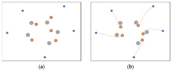 Figure 7a shows the grey threat area and cyan dynamic target randomly set before the test. The orange circle represents our UAVs. Different numbers in the circle correspond to different UAV numbers. Figure 7b illustrates the UAV training result following the initialization condition shown in Figure 7a, with the red curves representing the trajectory of the UAV tracking target. It can be seen from the figure that the UAV can successfully avoid the threat zone and successfully reach the target position. During this training process, UAVs 1 and 2 intelligently exchanged cross-domain dynamic targets according to the algorithm to avoid conflicts, perform intelligent resolution and complete target capture.