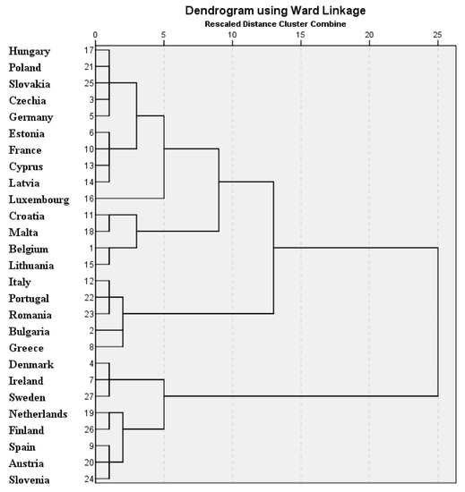 Taking into account the fact that the values of the bivariate correlation coefficients between the variables included in the analysis revealed significant correlations, the use of panel regression models was excluded, and a cluster analysis [60,61,62] was adopted for the two moments of time that delimit the analysed period in order to capture the similarities and disparities between EU member states regarding the evolutions of the percentage of Internet purchases by individuals.