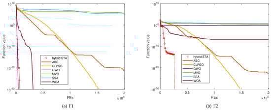 In this section, the fast convergence of NM-STA is briefly illustrated by a comparison between NM-STA and STA. To illustrate the effect of utilizing historical information, one classical test function is used, namely Rosenbrock (F7). NM-STA and STA are tested against the function in 2-D space, and each method is only terminated when a certain criterion is satisfied. After termination, the corresponding number of function evaluations (FEs) is recorded. For both STA and NM-STA, is set to 50, and is set to 10. In NM-STA, the threshold value for is set to 0.5, and the parameters in the NM simplex search are set as and , which are the same as in the standard implementation of an NM simplex search [31].