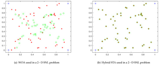 To further test the performance of hybrid STA, it was applied to the SNL problem. Furthermore, it was compared with other optimization algorithms, such as ABC, CLPSO, GWO, WOA, MVO and SSA. All the parameter settings of other algorithms were the same as in the references.