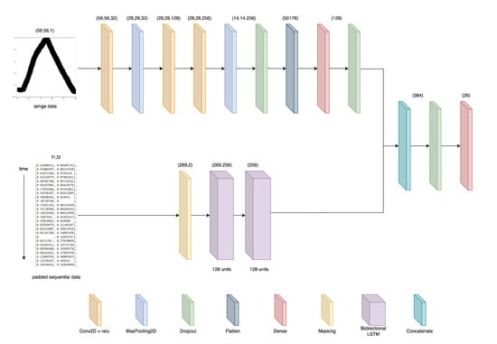In this work, we propose a hybrid deep-learning model for character recognition, which is based on the combination of CNN and BiLSTM-based models. The first took an input of a 56 × 56 × 1 image and then, we extracted image features by convolutional layers. The first convolutional layer used 32 convolutional filters of size 3 × 3. The second and third convolution layers were 128 and 256 convolution filters of size 3 × 3, respectively. All convolutional layers used rectified linear units (ReLU) as activation functions. The pooling layer used max pooling layer and the pooling size is 2 × 2. Following convolutional layers and max pooling layers, a dropout layer of 0.5, flatten layer, a fully connected layer with 128 units, a Relu activation function, and a dropout layer of 0.25 were appended. The second took the input of 296 × 2 coordinate data for alphabet recognition. In the case of digits recognition, it took the input of 154 × 2 coordinate data and extracted features of time series data from two BiLSTM layers. The number of units was 128 and the recurrent_droput is 0.5. Finally, the outputs from the CNN and BiLSTM layers were combined, a dropout layer of 0.5 is applied, and a fully connected layer with a SoftMax activation function was added in order to improve the recognition accuracy. The proposed used architecture for character recognition is shown in Figure 6.