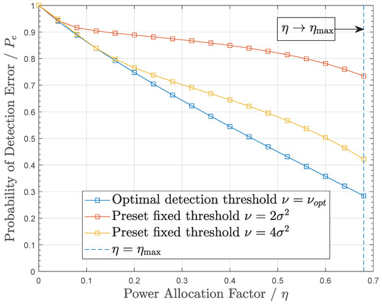 On the other hand, since E aims to minimize the PDE, it will never select the case of , which represents an absolute incorrect detection. Therefore, the optimal detection threshold for E, defined as , occurs only when . It can be calculated by , which has been solved and shown in numerical simulation. Furthermore, under the prescribed optimal detection threshold , the minimum PDE at E should be expressed as