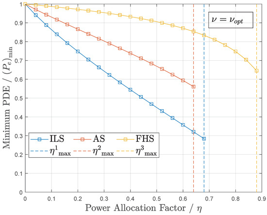 Figure 2 plots the PDE versus with diverse detection thresholds, where , and under ILS. Clearly, when , the eavesdropper can minimize its PDE. Moreover, it is clear that the rise of may create more randomness and can better hide source signals, which causes a larger detection error probability at E. Furthermore, when , approaches 1. In addition, it should be noted that there is an upper limit to the .