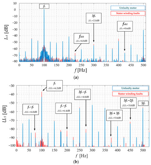 The detection of ITSC in the stator winding of a PMSM is most often carried out on the basis of a spectral analysis of phase currents. Amplitudes with characteristic frequencies are sought in the current spectrum and stray flux, respectively, as follows [20,21]: