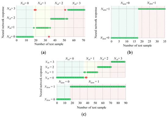 Experimental verification of the MLP-based fault detector of the PMSM motor: (a) inter-turn short-circuits; (b) permanent magnet fault; (c) mixed damage: Nsh—number of shorted turns, Ndem—permanent magnet technical condition (0—unfaulty, 1—partial demagnetization).