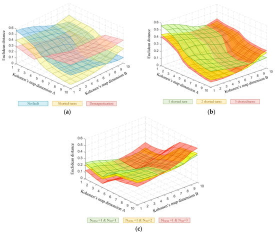 As can be observed in Figure 6a, the area of the map characteristic of no damage (blue color) is separated from those assigned to the failure states. Moreover, the areas characteristic of the stator (yellow color) and permanent magnet (red color) faults are located in the extreme parts of Kohonen’s map.